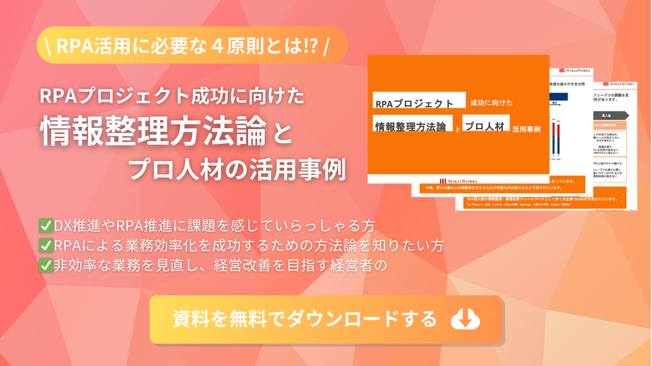 この記事にもあったようにRPAの導入には正しい効果をイメージして進めることが重要になります。そこで弊社では、RPAを導入する際に重要なポイントと導入効果を確認できるダウンロード資料を用意いたしました。RPAの導入を既に進めている方も、これから進めようとしている方も、ぜひダウンロードしてご一読ください。