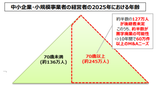 経営者の半数以上(約245万人)が70歳を超えており、深刻な高齢化が見て取れます。また、多くの中小企業が事業承継の時期を迎えているものの、少子高齢化や価値観の多様化により、親族内承継が難しくなっている現状があります。