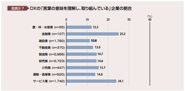 建設業界のDXは、企業レベルでの取り組みに大きな温度差があり、建設業全体としては遅れているのが実情です。独立行政法人情報処理推進機構(IPA)の「DX白書2023」によると、DXに取り組んでいる企業の割合は、全産業の中でも際立って低い11.4%に留まりました。
