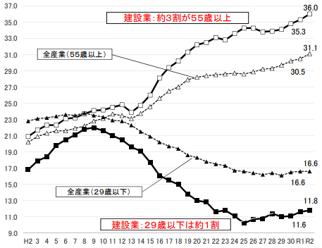 さらに、建設業界の全就業者のうち約36%が55歳以上の労働者であるのに対し、29歳以下の若手層は約12%に留まっており、全産業の平均と比べても高齢化が際立っています。