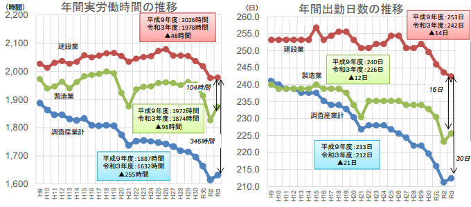 国土交通省の調査では、建設業の年間実労働時間や年間出勤日数は全産業平均を大幅に上回っており、長時間労働が常態化しているのが実情です。