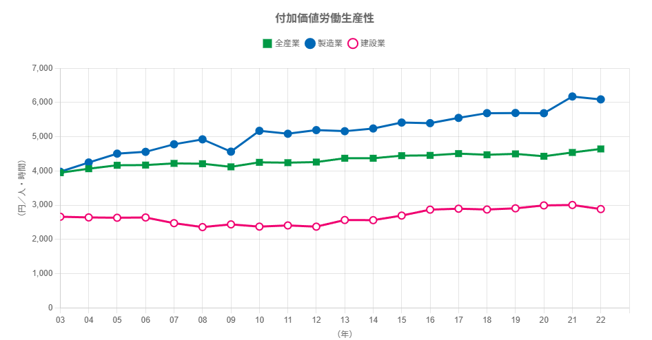 建設業は、他の産業と比較して「労働生産性が低い」という構造的な問題を抱えているのが現状です。日本建設業連合会の調査でも、生産性は長年、全産業の平均を大きく下回る水準で推移しています。
