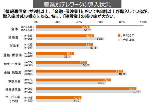 建設業界では、コロナ禍で一度は進んだテレワークが再び後退しており、柔軟な働き方への対応が遅れています。総務省の調査によると、建設業のテレワーク導入率はコロナ禍で一時的に増加したものの、2022年の63.6%をピークに、2023年には53.6%へと約10ポイントも減少しました。