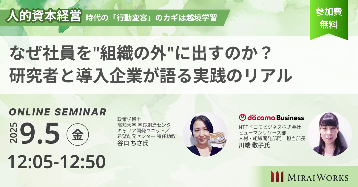 人的資本経営時代の「行動変容」のカギは越境学習~なぜ社員を"組織の外"に出すのか?研究者と導入企業が語る実践のリアル~ 「研修は実施しているが、現場での行動変容に繋がらない」 「自社の常識に染まり、新しい価値を創造できる人材が育たない」 「次世代リーダーに求められる『修羅場体験』を、どう設計すれば良いか分からない」 人的資本情報の開示が義務化され、「人材への投資」の重要性が叫ばれる一方、多くの企業でこうした根深い課題が聞かれます。 本ウェビナーでは、こうした課題へのブレークスルーとして、今、注目を集める「越境学習」をテーマに据えます。 今回は、実際に弊社の越境学習プログラム「B-SPARK」を導入されたNTTドコモビジネス株式会社の川端敬子氏と、越境学習研究の第一人者である谷口ちさ氏をお招きします。 「なぜ、自社の将来を担う人材を、あえて厳しい社外環境に送り出すのか?」 「『自分のスキルが社外で通用するか試す』経験は、本人と組織に何をもたらしたのか?」 越境学習研究の第一人者である谷口ちさ氏と共に、学術的知見と、導入企業だからこそ語れる生々しい実践知の両面から、これからの時代に本当に効く「人材育成」のあり方を紐解きます。 本ウェビナーで得られること ・なぜ今「越境学習」が人的資本経営の鍵となるのか ・越境学習を導入したリアルな課題感と目的 ・越境学習を導入し、人材育成を成功させるためのヒント このような方におすすめです ・次世代リーダー育成・経営人材育成の手法に課題を持つ経営者・人事責任者様 ・研修の効果測定や、参加者の行動変容に限界を感じている方 ・社員のキャリア自律を促し、組織を活性化させたい方 ・人的資本経営における具体的な施策を探している方 会場:オンライン配信(Zoomウェビナー) 開催日時:2025年9月5日(金)12:05~12:50 共催企業:株式会社みらいワークス NTTドコモビジネス株式会社 登壇者:高知大学 学び創建センター キャリア開発ユニット 特任助教 谷口 ちさ 氏 NTTドコモビジネス株式会社 ヒューマンリソース部 人材・組織開発部門 担当部長 川端 敬子 氏 申し込む こんな方におすすめ ・次世代リーダー育成・経営人材育成の手法に課題を持つ経営者・人事責任者様 ・研修の効果測定や、参加者の行動変容に限界を感じている方 ・社員のキャリア自律を促し、組織を活性化させたい方 ・人的資本経営における具体的な施策を探している方 セミナー概要 日時 2025年9月5日(金)12:05~12:50 参加料 無料 視聴方法 Zoomでのオンライン配信 動画視聴方法につきましては、お申し込みフォームからご登録いただいた後、メールにてご案内させていただきます。当日のご案内メールが届かない方はお手数ですが(client_info@mirai-works.co.jp)までご連絡ください。 ご注意 Wi-Fi環境など、高速通信が可能な電波の良い所でご視聴ください。 ※ 講師・共催企業と同業の方はお申込みをお断りする可能性がございます。 ※ 講演内容は予告なく変更になる可能性がございます。 登壇者 高知大学 学び創建センター キャリア開発ユニット 特任助教 谷口 ちさ 氏 高知市立南海中学校、土佐高等学校、関西大学 社会学部 卒業。 企業人事(日本IBM、ファミリーマート、大地を守る会)として15年間の経歴を積む中で、社会人大学院生として法政大学大学院 政策創造研究科 修士課程に入学、首席で修了。 その後フリーランスとなり、キャリア論や組織行動論の知見を活かした調査・分析やワークショップ開発、明星大学 経営学部の非常勤講師などに従事。 2024年より現職。主な研究分野はキャリア開発、メンタリング、デベロップメンタル・ネットワーク。 登壇者 NTTドコモビジネス株式会社 ヒューマンリソース部 人材・組織開発部門 担当部長 川端 敬子 氏 1996年NTTに入社。関西での法人営業からキャリアをスタートし、データセンター事業創設期にNTTコミュニケーションズへ転籍し、上京。 ホスティングを中心としたコンサルセールス、NTT Americaでの海外トレイニーを経て、クラウドサービスのサービスマネージャーに従事。その後、人事・人材開発分野に軸足を移し、2023年7月より、ヒューマンリソース部(HR部) 人材・組織開発部門 担当部長として、自律的なキャリア形成と対話協働する組織開発を推進中。 セミナー内容 ・登壇者の紹介 ・越境を導入したリアルな課題感と目的 ・越境の成果 ・越境で人材育成を成功させるためのポイント