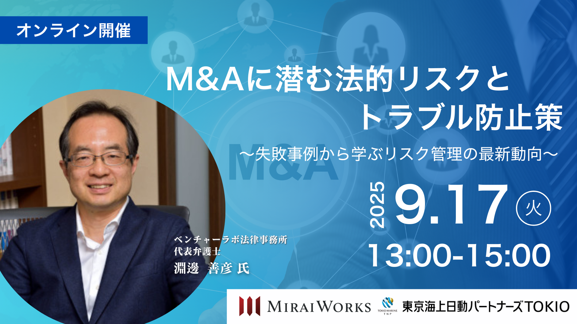 本セミナーでは、企業法務に精通した弁護士が、実際の紛争事例や裁判例をもとに、M&Aにおける法的な落とし穴とその防止策を解説いたします。特に、契約交渉・デューデリジェンス・表明保証など、法務リスクを回避するための具体的なポイントに焦点を当ててご説明いたします。