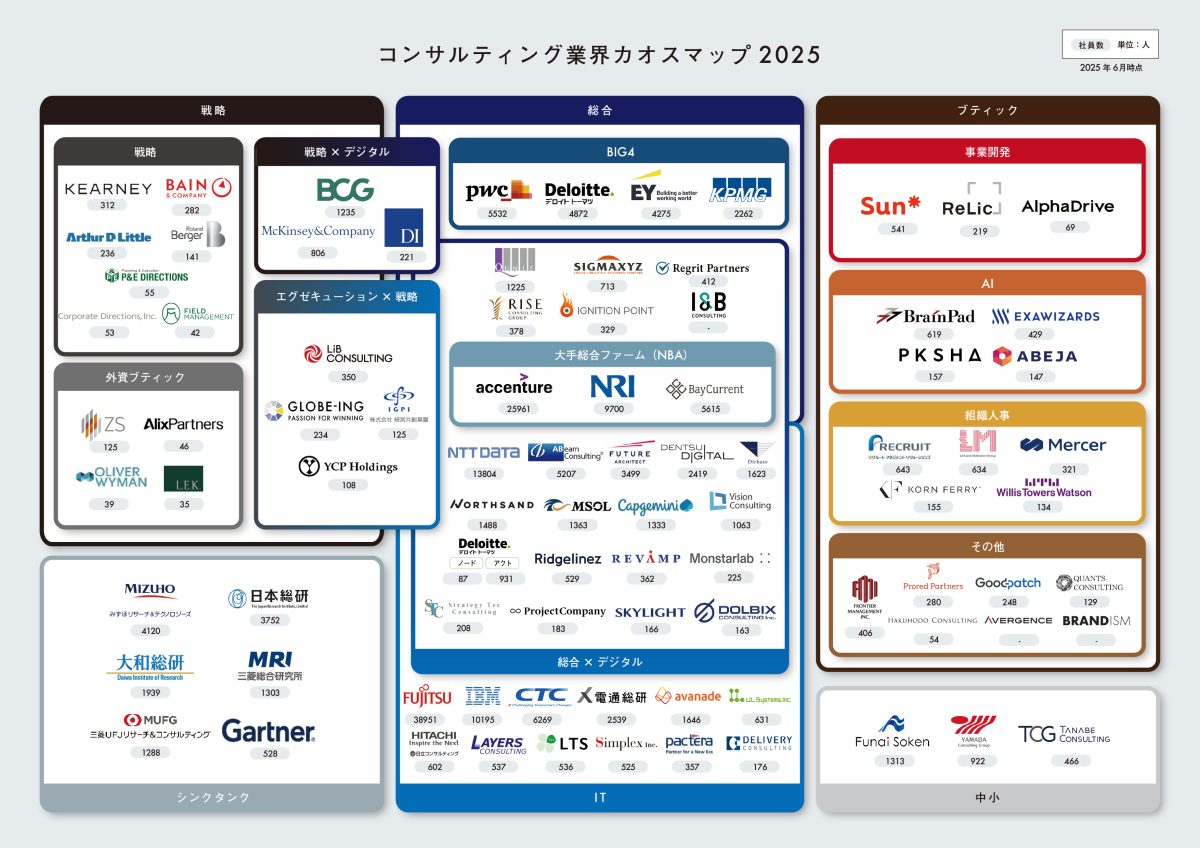 リブ・コンサルティングは2025年7月7日、「コンサルティング業界カオスマップ2025」を公開しました。コンサルティングファームを主要領域別にマッピングするほか、各コンサルティングファームの社員数やカテゴリー別の社員数の推移も合わせて公開しました。コンサルティング業界全体の把握や各コンサルティングファームの特徴や強みを知るのに役立ちます。
