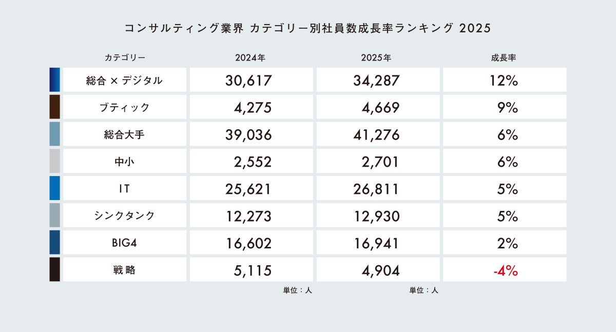 2024年から2025年にかけて社員数がもっとも増えたカテゴリは「総合×デジタル」で、成長率は+12%でした。次に成長率が高かったのは「ブティック」で+9%でした。なお、2025年の社員数がもっとも多いカテゴリは「総合大手」で、4万1276人でした。成長率がマイナスに転じたカテゴリは「戦略」で、社員数は2024年の5115人から2025年は4904人に減っています(成長率は-4%)。