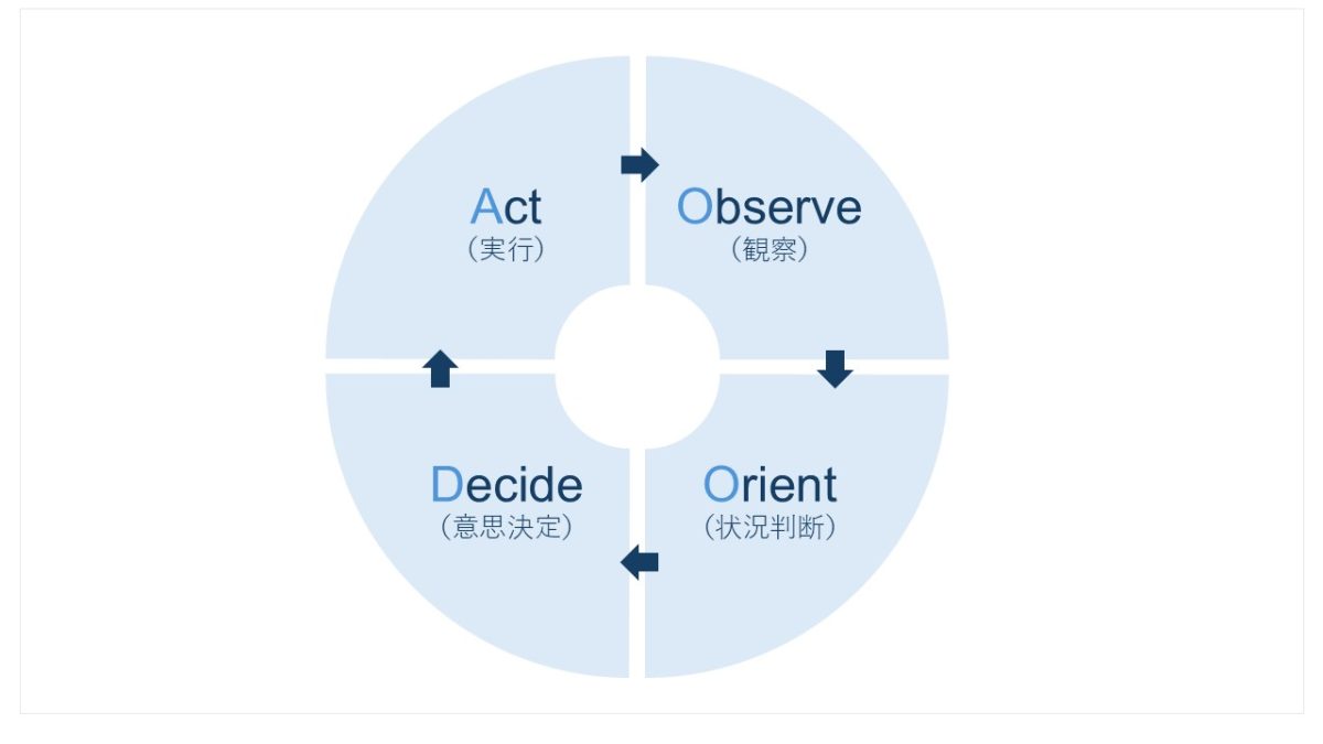 OODAループとは、Observe(観察)、Orient(状況判断)、Decide(意思決定)、Act(実行)という4つのプロセスを繰り返す意思決定のフレームワークです。