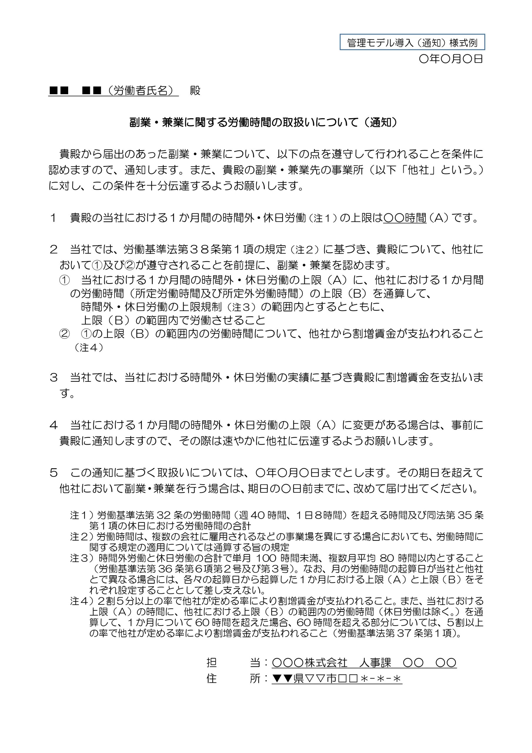 A社とB社、あるいはさらに複数社での副業を行う場合は、それぞれの企業が労働者を通じて合意することによって導入するものとされています。合意文書については厚生労働省から例示されています(下記)が、これを参照すると企業間での契約の形になっておらず、あくまで労働者への申告に基づいた通知書の形になっています。