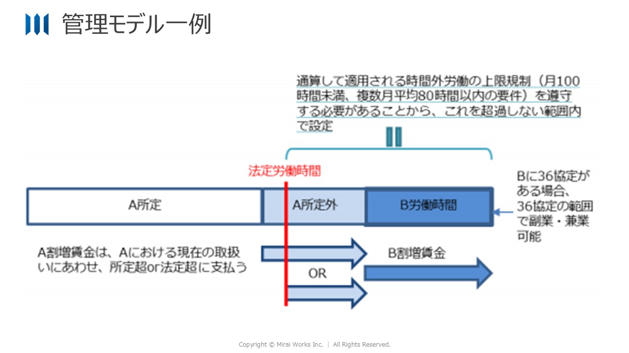 例えば、A社は所定内外合わせて1日10時間まで(うち法定時間外2時間)、B社は全て法定時間外労働として1日5時間までと設定し、各企業が自社の範囲内で管理すれば、他社の労働時間を日々把握する必要がありません。ただし、全ての関係企業の合意が必要であり、特に副業先が全労働時間について割増賃金を支払う必要があるため、実務上の普及は限定的でした。