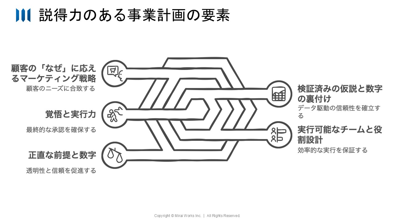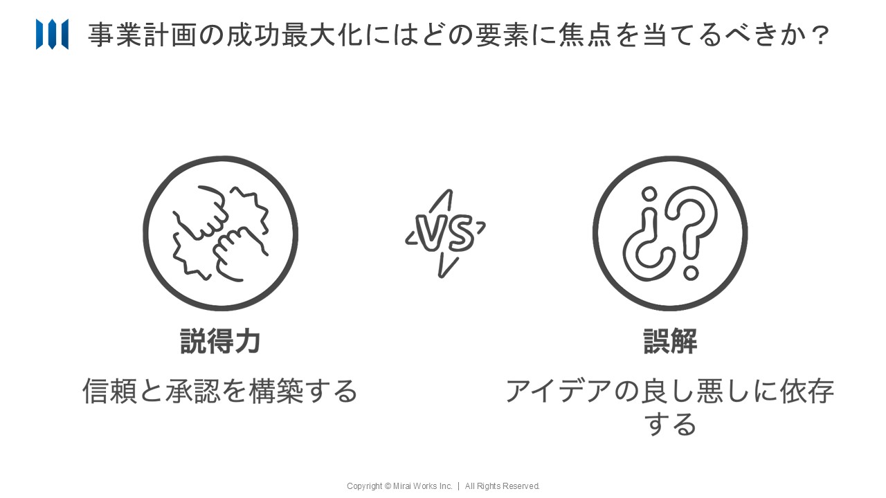 ビジネスの現場において、事業計画は「やりたいことを説明する資料」ではない。社内の稟議を通し、実行の承認を得るための信頼構築ツールである。事業計画の成否を分けるのは、独創的なアイデアだけではありません。むしろ、そのアイデアをいかに周囲に理解してもらい、共感を得られるか、つまり説得力が重要になります。