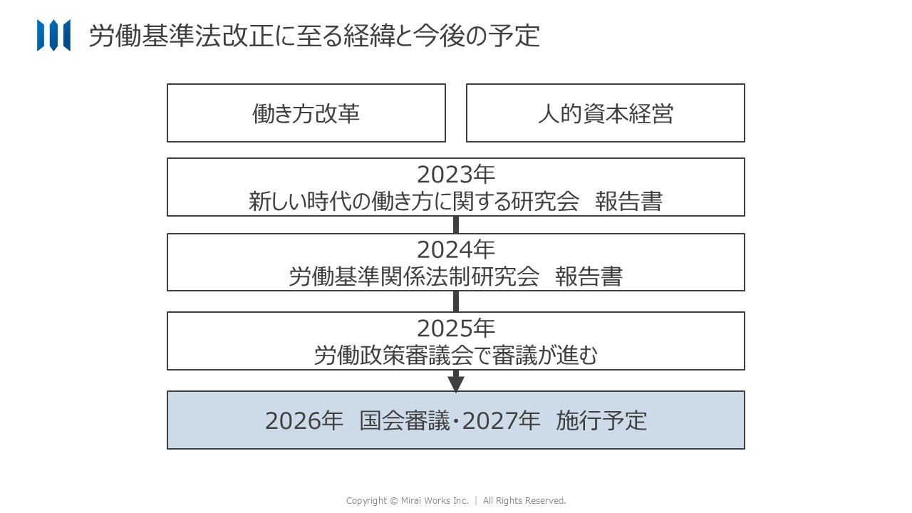 2023年以降、労働基準法改正議論が本格始動します。厚生労働省に「新しい時代の働き方に関する研究会」が置かれ、多くの検討が行われました。その後、具体的な改正論点の議論を行う場として、2024年からは「労働基準関係法制研究会」が設置されました。「40年に一度の大改正」という位置づけのもと、23以上の改正論点が整理されました。