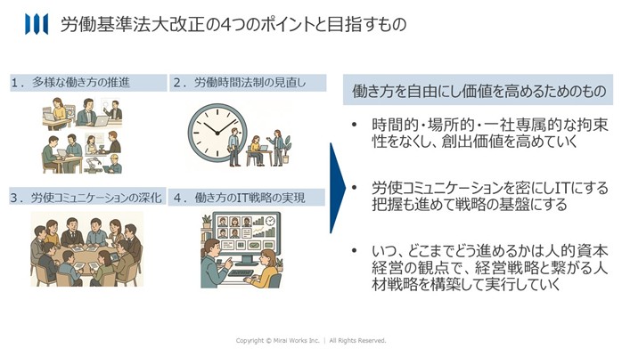第三に「労使コミュニケーションの深化」として過半数代表制の改善が、第四に「働き方のIT戦略」としてデジタル化に対応した制度整備が論点となっています。