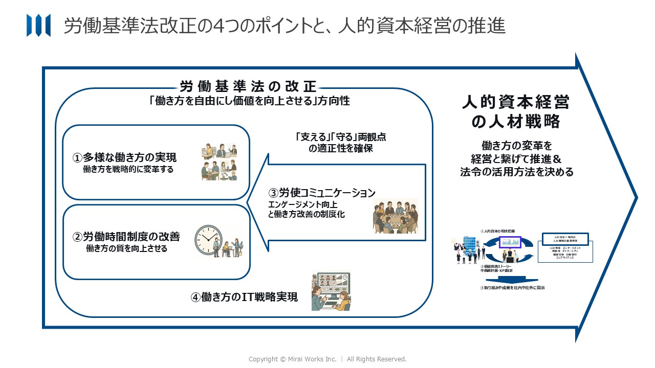 一つは、40年ぶりとなる労働基準法の抜本改正。二つ目は、AI政策の進展と、それに伴う雇用設計の前提の変化。そして三つ目が、人的資本可視化指針の改訂と金融商品取引法改正による開示の実質化です。