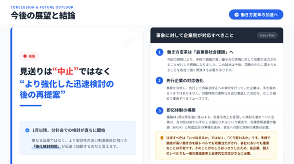 第二幕は、高市政権が設置した日本成長戦略会議からの指示です。「企業の活力をそがない労働時間規制の緩和」という方向性が加わりました。厚労省が進めてきた規制強化路線と、政権の規制緩和方針の調整が続いています。裁量労働制の適用範囲拡大なども新たな検討課題として浮上しています。