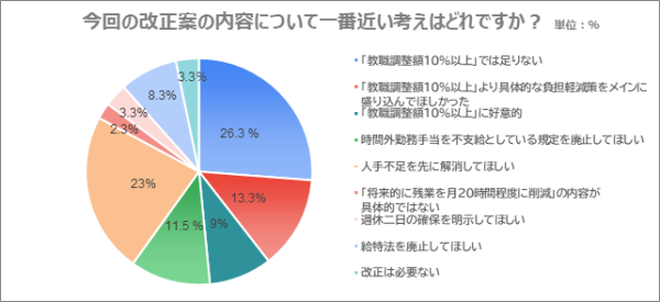 「『教職調整額10%以上』では足りない」と答えた割合がもっとも多く、26.3%を占めました。「週休二日の確保を明示してほしい」(23.0%)、「『教職調整額10%以上』より具体的な負担軽減策をメインに盛り込んでほしかった」(13.3%)と続きます。