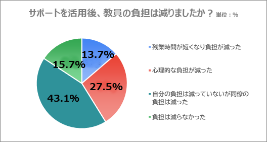 「自分の負担は減っていないが同僚の負担は減った」がもっとも多く、43.1%を占めました。この結果に加え、「心理的な負担が減った」(27.5%)と「残業時間が短くなり負担が減った」(13.7%)を合わせると、8割以上の教員が負担の軽減を実感していることが分かります。