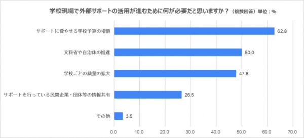 「サポートに費やせる学校予算の増額」がもっとも多く、62.8%の教員が予算増額の必要性を感じています。以下、「文科省や自治体の推進」(50.0%)、「学校ごとの裁量の拡大」(47.8%)と続きます。