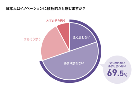 積極的かどうかという質問に対し、「全く思わない」と「あまり思わない」を合わせた割合は69.5%を占めます。約7割の人が、日本人はイノベーションに消極的というイメージを持っていることが分かります。