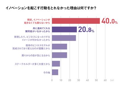 もっとも多かったのは「現状、イノベーションが起きなくても困らないから」で、40.0%でした。2位は「共に進めてくれる賛同者がいなかったから」で、20.8%でした。調査を実施したG’s ACADEMYはこの結果について、イノベーションがもたらす好影響を理解できる人が少ないのではと推察します。