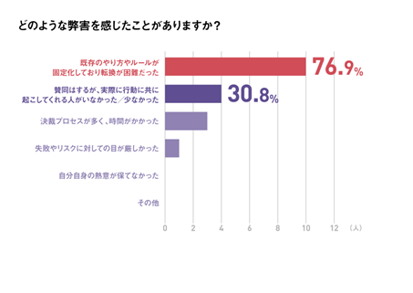 結果は、「既存のやり方やルールが固定化しており、転換が困難だった」と回答した割合がもっとも多く、76.9%でした。2位には「賛同はするが、実際に行動に共に起こしてくれる人がいなかった/少なかった」(30.8%)が続きます。