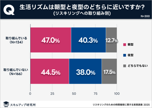 リスキリングに取り組んでいる人と取り組んでいない人で、生活リズムに違いがあるのかを調べた結果が図1です。朝型か夜型かを聞いています。