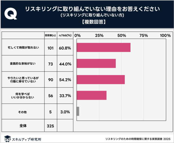 もっとも多かったのは「忙しくて時間が取れない」で60.8%でした。調査からリスキリングに取り組む際の時間確保が大きな障壁になっていることが読み取れます。なお、2位は「やりたいと思っているが行動に移せていない」(54.2%)、3位は「金銭的な余裕がない」(44.0%)でした。