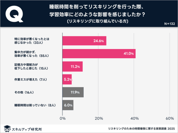 もっとも多かったのは「集中力が続かず、効率が悪くなった」で41.0%でした。2位は「特に効率が悪くなったとは感じなかった」(24.6%)、3位は「その他」(11.9%)、4位は「記憶力や理解力が低下したと感じた」(11.2%)でした。調査を実施したスキルアップ研究所は、睡眠時間を削る無理なスケジュールでは学習の質を低下させると指摘。計画を立てる際は、可能な範囲内で効率を重視し、健康的な時間管理を心掛けるのが望ましいと訴えます。