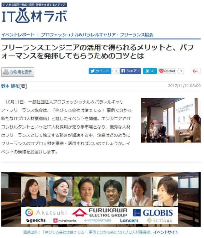 以前当ホームぺージでもお伝えしました、フリーランス協会主催・みらいワークス共催のイベント『伸びてる会社は使ってる!事例で分かる新たなITプロ人材獲得術』の模様が、IT人材の採用・育成・活用・評価を支援するメディア『IT人材ラボ』に掲載されました。