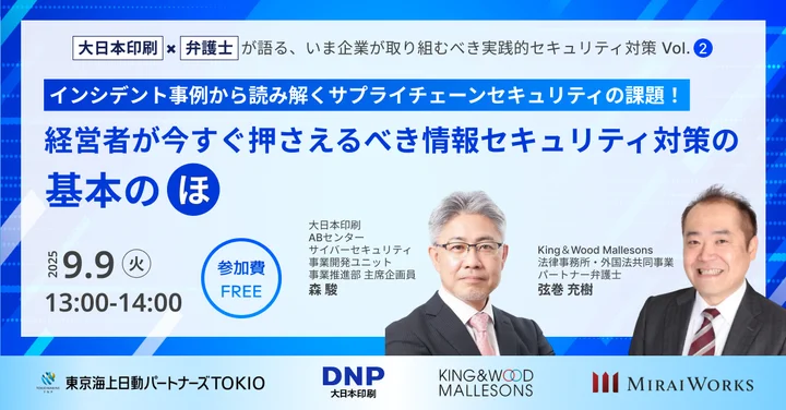 【セミナー告知】9月9日(火)13:00~、インシデント事例から読み解くサプライチェーンセキュリティの課題!経営者が今すぐ押さえるべき情報セキュリティ対策の基本の「ほ」|オンライン開催