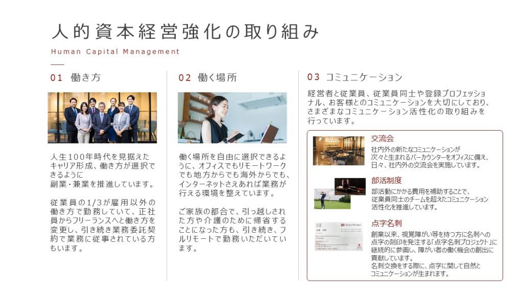 当社は、「プロフェッショナル人材が挑戦するエコシステムを創造する」をビジョンに掲げ、人生100年時代に、プロフェッショナル人材が、「独立、起業、副業、正社員」といった働き方や働く場所、働く目的に縛られない挑戦の機会提供とその挑戦の支援を行うための事業を展開しています。このビジョン実現のために、登録プロフェッショナルだけではなく、従業員ひとり一人の価値を最大限生かせるよう、人材の多様化、場所に縛られない働き方を推進し、従業員のWell-being向上に努めております。