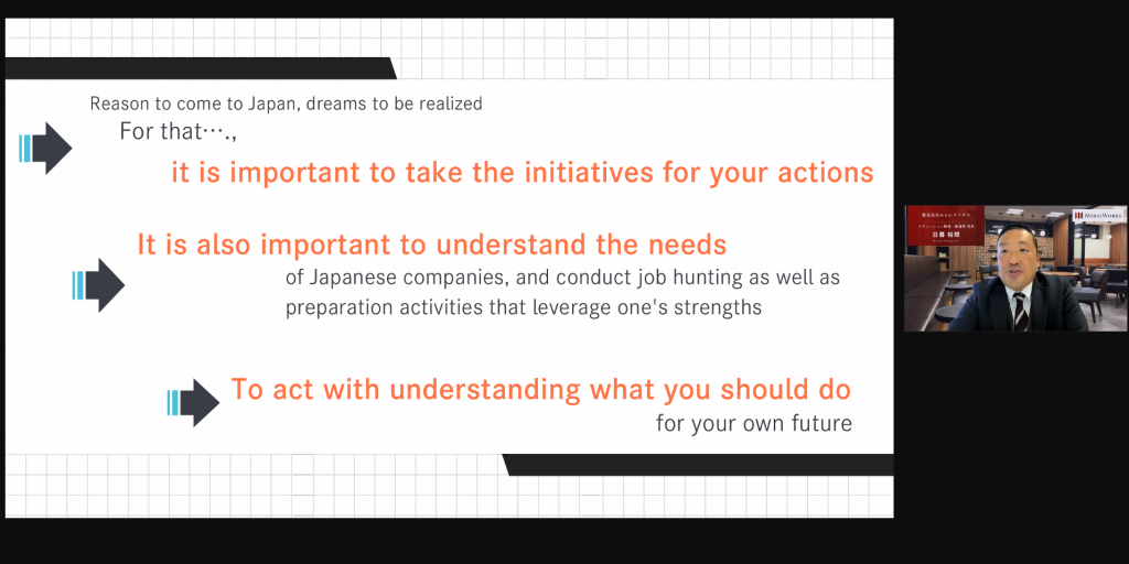 日本でのキャリア実現に向けて、「自ら行動を起こすこと」「日本企業のニーズを理解し、自己の強みを活かした準備をすること」、そして「自身の将来のために何をすべきかを理解して行動すること」の重要性を強調しました。