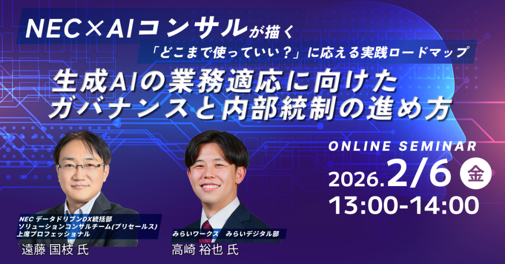 【セミナー告知】2月6日(金)13:00~生成AIの業務適応に向けたガバナンスと内部統制の進め方~NEC×AIコンサルが描く、「どこまで使っていい?」に応える実践ロードマップ~|オンライン開催