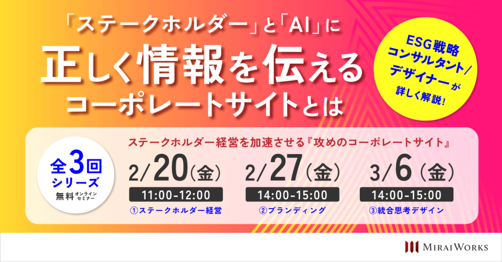 【セミナー告知】2月20、27日、3月6日に、ステークホルダー経営を加速させる『攻めのコーポレートサイト』とは財務・非財務情報の「見せ方」と「ナラティブ」が企業の評価を変える|オンラインセミナー開催