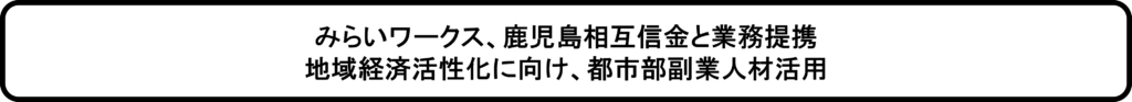 株式会社みらいワークス(本社:東京都港区、代表取締役社長:岡本祥治、以下「当社」)は、鹿児島相互信用金庫(本店:鹿児島県鹿児島市、理事長:永倉悦雄、以下「鹿児島相互信金」)と人材支援による地域企業の事業強化を目的とした業務提携契約を締結したことをお知らせいたします。また、今回の鹿児島相互信金との提携をもって、20の地域金融機関と地方転職・副業人材の活用を推進することとなります。