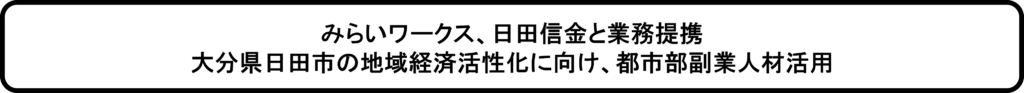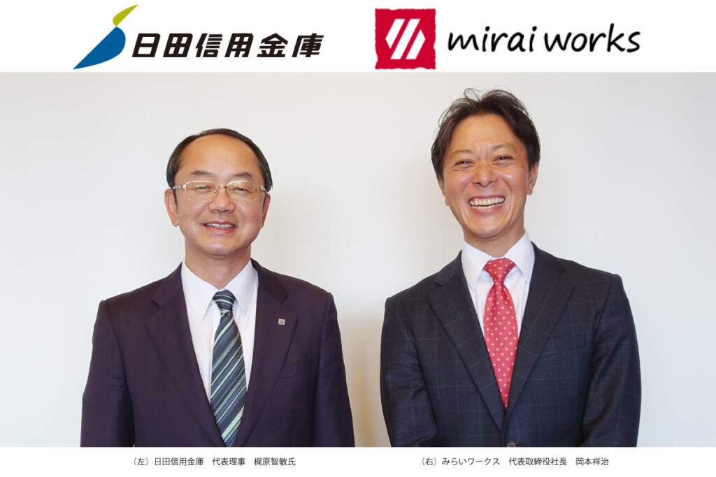 株式会社みらいワークス(本社:東京都港区、代表取締役社長:岡本祥治、以下「当社」)は、日田信用金庫(本店:大分県日田市、代表理事:梶原智敏、以下「日田信金」)と人材支援による地域企業の事業強化を目的とした業務提携契約を締結したことをお知らせいたします。また、今回の日田信金との提携をもって、23の地域金融機関と地方転職・副業人材の活用を推進することとなります。