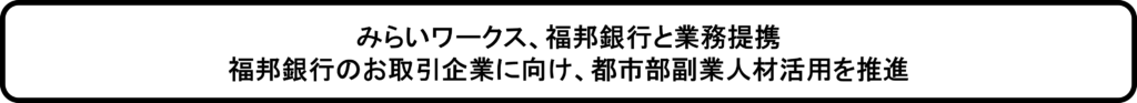株式会社みらいワークス(本社:東京都港区、代表取締役社長岡本祥治、以下「当社」)は、株式会社福邦銀行(本店:福井県福井市、代表取締役頭取 渡邉健雄、以下「福邦銀行」)と、人材支援による地域企業の事業強化を目的とした業務提携契約を締結したことをお知らせいたします。