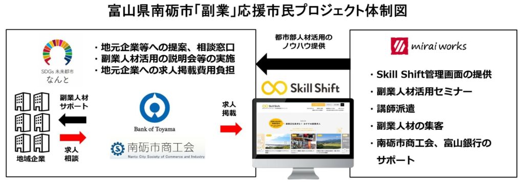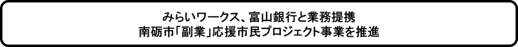 株式会社みらいワークス(本社:東京都港区、代表取締役社長 岡本祥治、以下「当社」)は、株式会社富山銀行(本店:富山県高岡市、代表取締役頭取 中沖雄、以下「富山銀行」)と人材支援による地域企業の事業強化を目的とした業務提携契約を締結したことをお知らせいたします。本締結により、富山県南砺市(市長 田中幹夫)と南砺市商工会(会長 川合声一)、富山銀行、当社で「副業」応援市民プロジェクト事業(※1)の推進を加速して参ります。