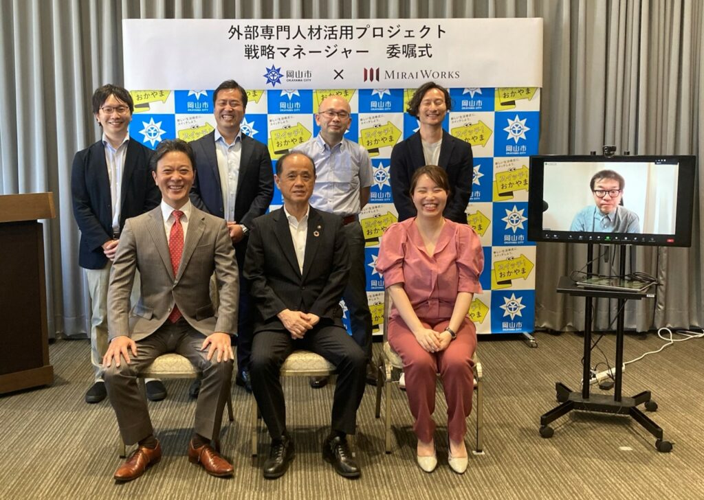 (前列)左から、みらいワークス代表取締役社長 岡本祥治、岡山市長 大森雅夫、戦略マネージャー 李知恩、戦略マネージャー 谷浩明(オンライン)(後列)左から、戦略マネージャー 長谷川大貴、戦略マネージャー 梅本哲平、戦略マネージャー 河野有吾、戦略マネージャー 佐方一紀 ※敬称略