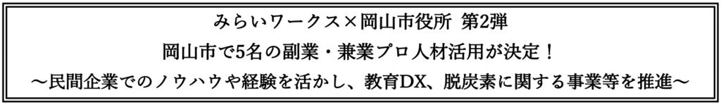 岡山県 岡山市役所 第2弾 岡山市で5名の副業・兼業プロ人材活用が決定しました。