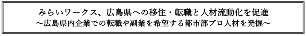 プロフェッショナル人材のフリーランス・副業・転職といった多様な働き方をサポートする株式会社みらいワークス(本社:東京都港区、代表取締役社長:岡本祥治、証券コード:6563、以下「当社」)は、広島県より「首都圏人材掘り起こし業務」の業務受託企業に選定された事をお知らせいたします。今後、当社は、広島県内企業の特徴や魅力を、首都圏を中心とした都市部プロフェッショナル人材に発信することで、広島県企業への転職や副業を希望する都市部プロフェッショナル人材を発掘します。