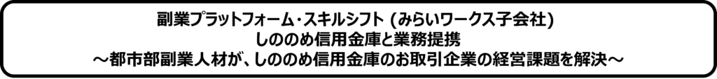 株式会社みらいワークス(本社:東京都港区、代表取締役社長:岡本祥治、証券コード:6563)の子会社である、副業マッチングプラットフォームを展開する株式会社スキルシフト(本社:東京都港区、代表取締役社長:岡本祥治 以下「スキルシフト」)は、しののめ信用金庫(本店:群馬県富岡市、理事長:横山慶一、以下「しののめ信金」)と、地域企業の人材確保を目的とした業務提携契約を締結したことをお知らせいたします。