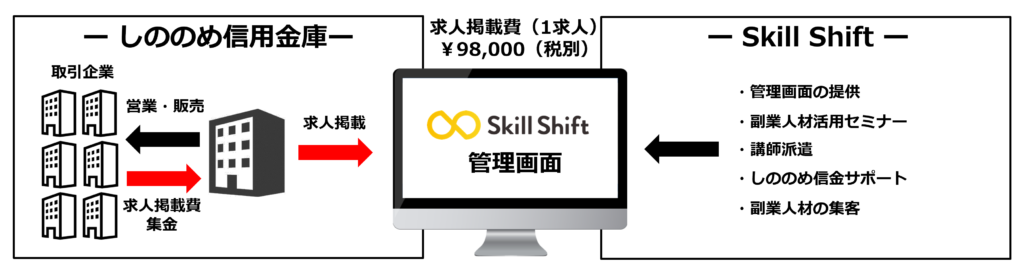 しののめ信金が、人材不足に課題を抱えるお取引先の企業に『Skill Shift』をご紹介し、しののめ信金が、お取引先の企業より1求人当たり98,000円(税別)の掲載費を集金し、求人情報を『Skill Shift』に掲載します。金融庁による有料職業紹介事業の解禁を受け※1、各社が人材紹介を開始していますが、今回の提携により、しののめ信金は有料職業紹介の免許を取得しなくても、『Skill Shift』へお取引企業の求人情報を掲載することで、副業人材活用を促進することができます。今回の提携により、自らのスキルを地域貢献に生かしたい副業人材と、外部人材を受け入れて課題を解決したいという人材としののめ信金のお取引企業をマッチングすることにより、関係人口※2の創出・増加、人材流動化やスキルシェアにつなげ、日本経済の活性化に貢献して参ります。