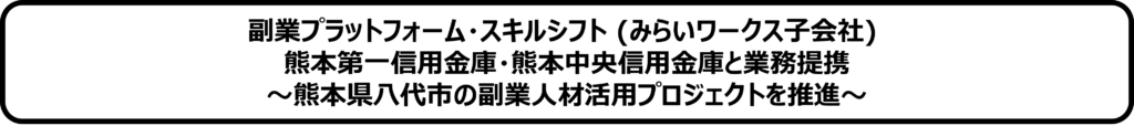 株式会社みらいワークス(本社:東京都港区、代表取締役社長:岡本祥治、証券コード:6563)の子会社である、副業マッチングプラットフォームを展開する株式会社スキルシフト(本社:東京都港区、代表取締役社長:岡本祥治 以下「スキルシフト」)は、熊本第一信用金庫(理事長:豊住賢一、以下「熊本第一信金」)、熊本中央信用金庫(理事長:沼田雄一、以下「熊本中央信金」)と、地域企業の人材確保を目的とした業務提携契約を締結し、八代商工会議所(会頭:松木喜一)と八代市商工会(会長:建貝幸一郎)、八代市を含めた連携の枠組みで、熊本県八代市の「八代市産業活性化!副業人材活用プロジェクト」を推進することをお知らせいたします。