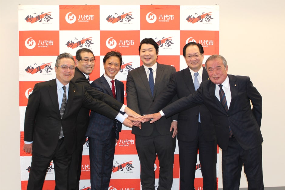 左から、八代商工会議所 会頭 松木喜一、 熊本中央信金 理事長 沼田雄一、 スキルシフト 代表取締役社長 岡本祥治、八代市 経済文化交流部長 山本哲也 、 熊本第一信金 理事長 豊住賢一 、 八代市商工会 会長 建貝幸一郎