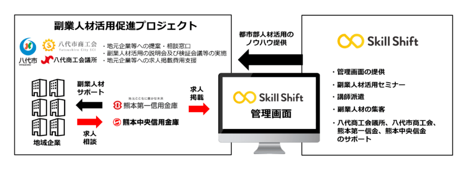 熊本第一信金、熊本中央信金が、人手・人材不足に課題を抱えるお取引先企業に『副業人材の活用』をご紹介し、お取引先企業または会員企業の経営課題を解決するための副業求人情報を『Skill Shift』に掲載します。八代商工会議所、八代市商工会は、上記の課題を抱える会員事業所に『副業人材の活用』をご紹介し、連携先の信用金庫を通し、掲載や掲載後のフォローアップを行い、会員事業所のサポートを行います。八代市はプロジェクト推進のために、本来、『Skill Shift』の利用にかかる求人掲載費用の支援ならびに、副業人材活用の説明会及び検証会を実施します。スキルシフトは、『Skill Shift』管理画面の提供、副業人材活用セミナーの開催、副業人材の集客、副業人材活性化のサポートを実施します。本プロジェクトを推進することにより、自らのスキルを地域貢献に生かしたい副業人材と、外部人材を受け入れて課題を解決したいという八代市の企業をマッチングすることにより、関係人口※1の創出・拡大、人材流動化やスキルシェアにつなげ、地域経済の活性化に貢献して参ります。