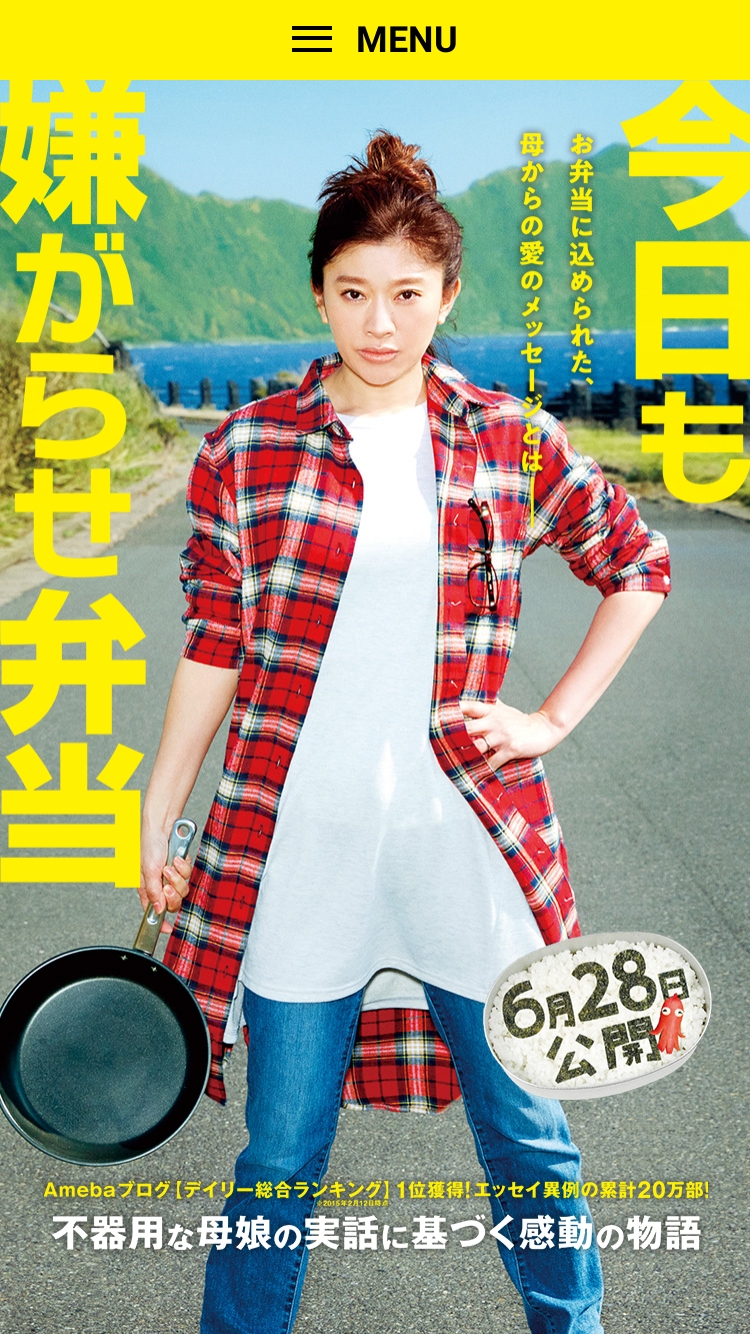 映画『今日も嫌がらせ弁当』公式サイト http://www.iyaben-movie.com/ 映画『今日も嫌がらせ弁当』2019年6月全国公開 エンタメ公式サイト エンタメ・趣味・娯楽 Created By 株式会社AWAKE 他の制作物 募集中の求人 掲載修正・取下げ依頼 制作会社情報元 引用元:http://www.iyaben-movie.com/ 本ページは、本サイト掲載日時点で公開されているサイトより、画面キャプチャ画像を引用し掲載しています。また各クリエイティブカンパニーの制作実績ページ・SNSより企業情報を紐づけています。掲載取下げ依頼、または修正依頼はコチラよりご連絡ください。