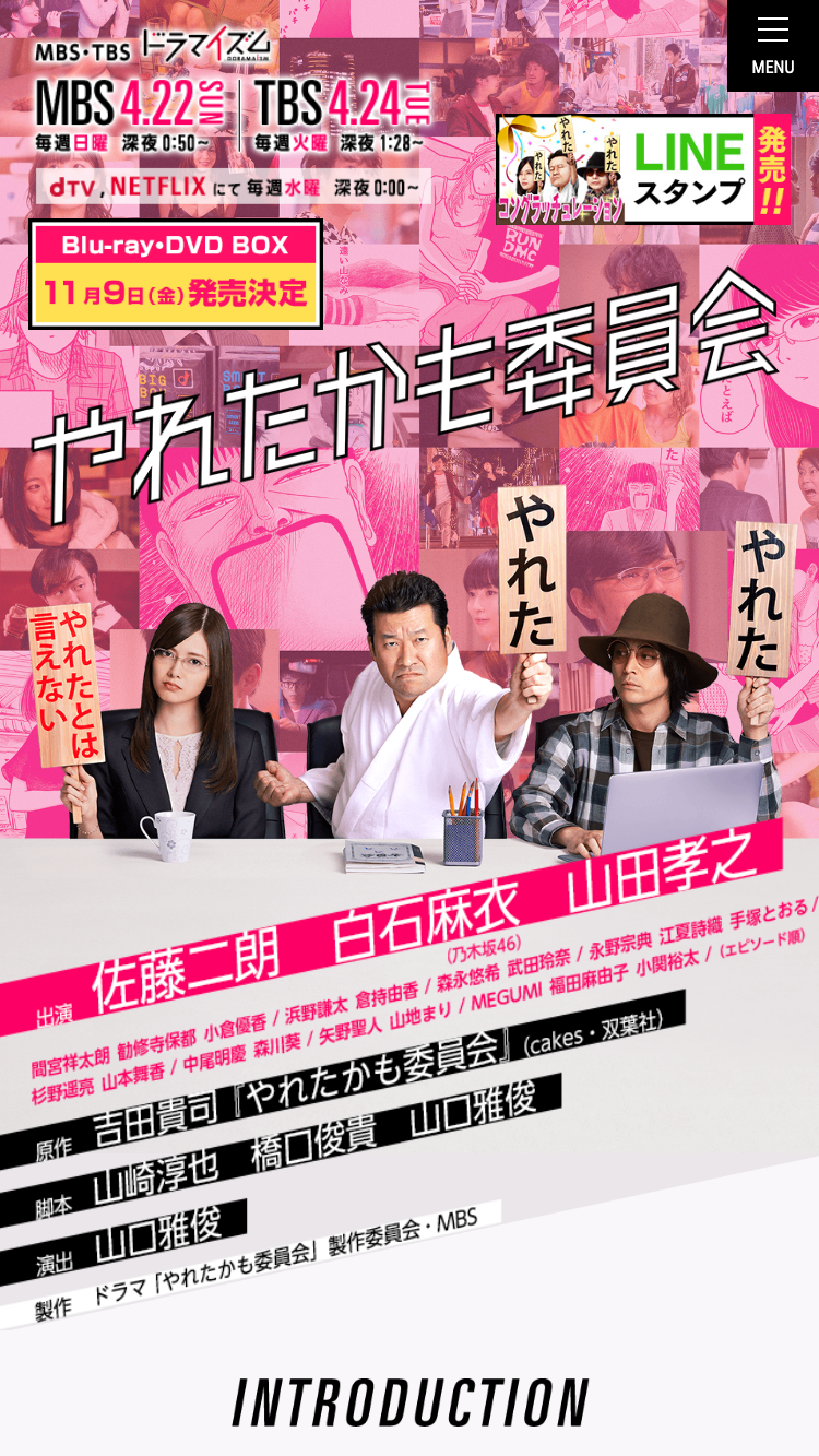 http://yaretakamoiinkai.com/テレビドラマ「やれたかも委員会」公式サイト。2018年4月深夜放送スタート。出演:佐藤二朗、白石麻衣、山田孝之、ほか豪華ゲスト