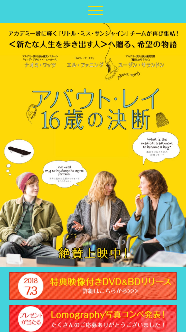 映画『アバウト・レイ 16歳の決断』公式サイト http://aboutray16-eiga.com/ 映画『アバウト・レイ 16歳の決断』公式サイト。絶賛上映中! エンタメ公式サイト エンタメ・趣味・娯楽 Created By 株式会社AWAKE 他の制作物 募集中の求人 掲載修正・取下げ依頼 制作会社情報元 引用元:http://aboutray16-eiga.com/ 本ページは、本サイト掲載日時点で公開されているサイトより、画面キャプチャ画像を引用し掲載しています。また各クリエイティブカンパニーの制作実績ページ・SNSより企業情報を紐づけています。掲載取下げ依頼、または修正依頼はコチラよりご連絡ください。