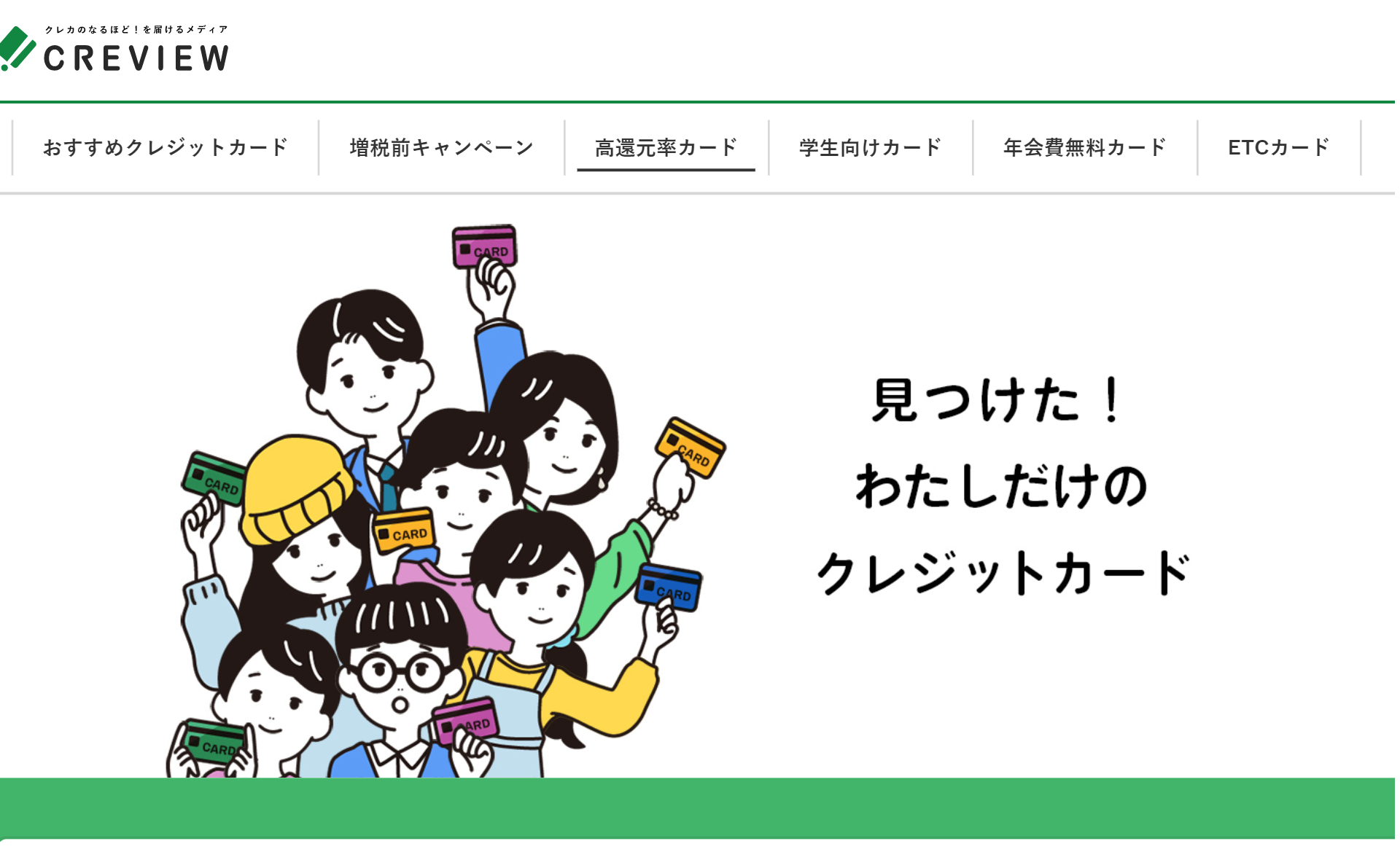クレジットカードの総合情報サイト「CREVIEW(クレビュー)」2018年現在、ひとり当たりのクレジットカードの保有枚数は2~3枚。カード保有率は80%を超えています。しかし一方で、日々の決済手段としてカードをうまく使いこなせていない、という方が存在するのも事実。 CREVIEWでは、クレジットカードの作り方はもちろん、「高還元率カードはどれ?」「学生向けのおすすめカードは?」「ポイントをたくさん得る方法は?」など、一人ひとりの悩みに対して最適な答えをお届けします。実際のカード利用者の声や、独自の切り口での比較を踏まえ、皆さんに「なるほど!」と言ってもらえるようなサイトを目指しています。